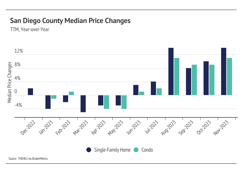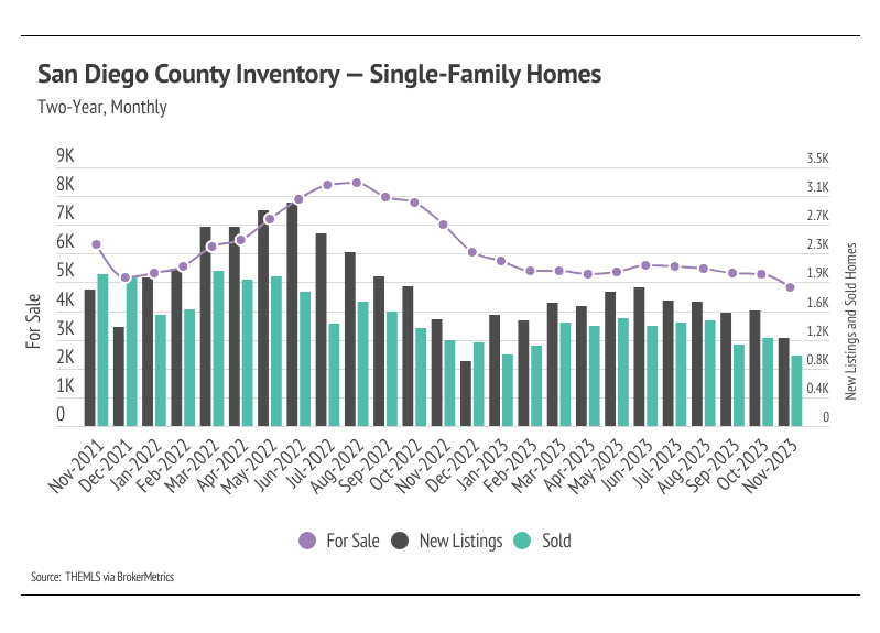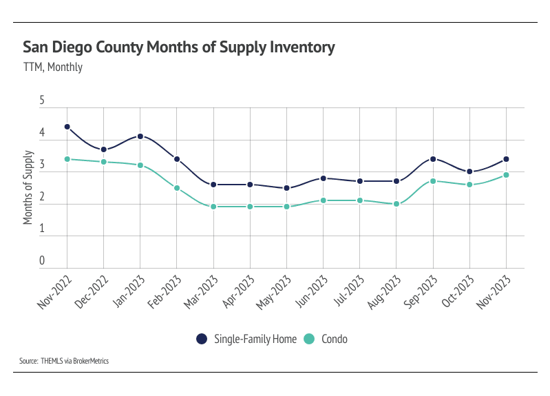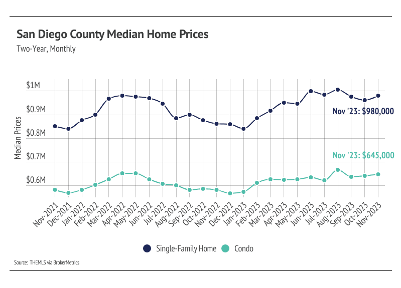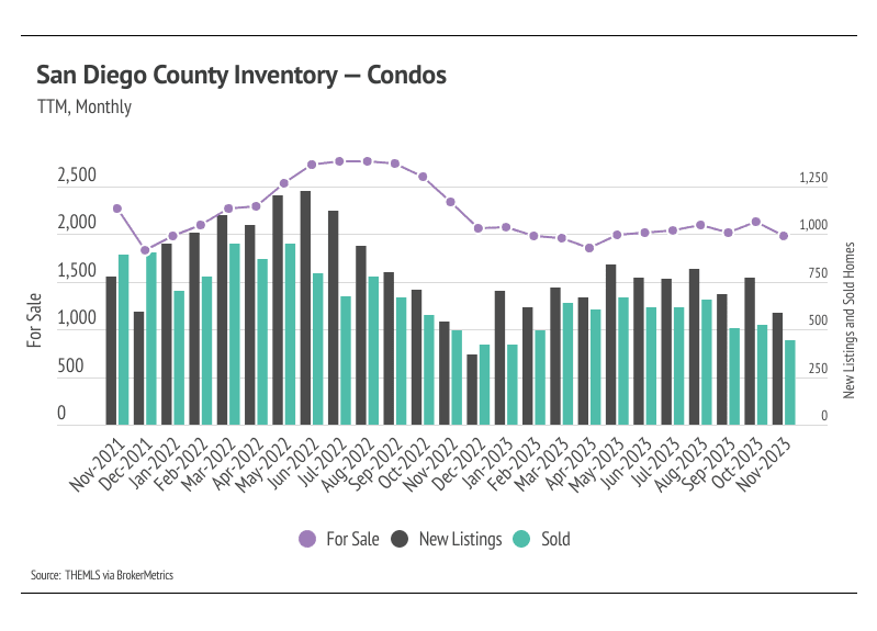 In San Diego County, the home prices seem to be impervious to rising mortgage rates, even hitting all-time highs in August 2023. In November, the median single-family home and condo prices were 2.4% and 3.0% below the August peaks, respectively, but slight price contractions are normal in the second half of the year. We expect prices to remain slightly below peak in the winter months, but as interest rates decline, prices will almost certainly reach new highs in the first half of 2024. Additionally, the sustained downward inventory trend and low number of new listings will only raise prices as demand grows. However, more homes must come to the market in the spring and summer to get anything close to a healthy market.
