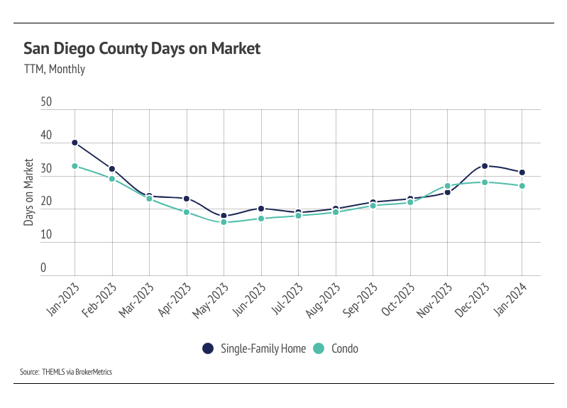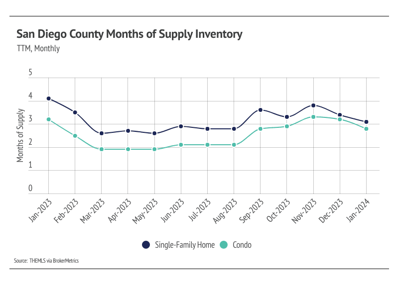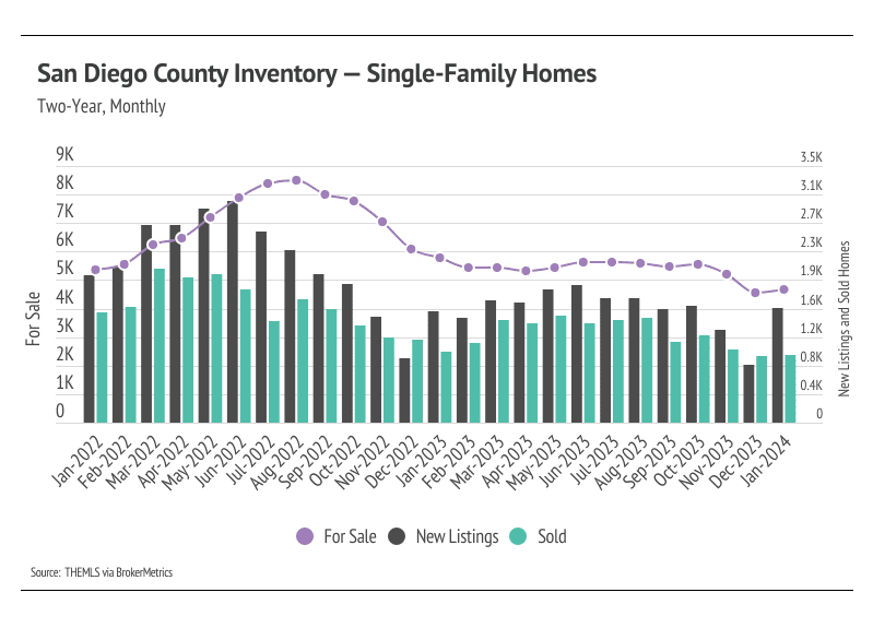 High mortgage rates have softened both supply and demand in the San Diego real estate market. As rates fall, it is anticipated that more sellers will enter the market, addressing the supply shortage. Rising demand alone cannot fully stimulate the market without an adequate supply of homes. Unlike 2023, the inventory in 2024 is expected to follow more typical seasonal patterns, with inventory levels increasing in January or February and peaking in July or August.