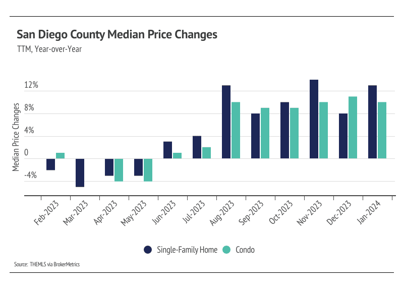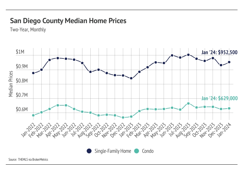 The San Diego real estate market experienced a rise in median prices for single-family homes and condos in January 2024, despite the impact of higher mortgage rates. Low inventory levels have offset downward price pressure, and the market is showing signs of a more typical seasonal pattern. In this blog, we will explore the current state of median prices, inventory levels, and the supply-demand dynamics in the San Diego real estate market.
