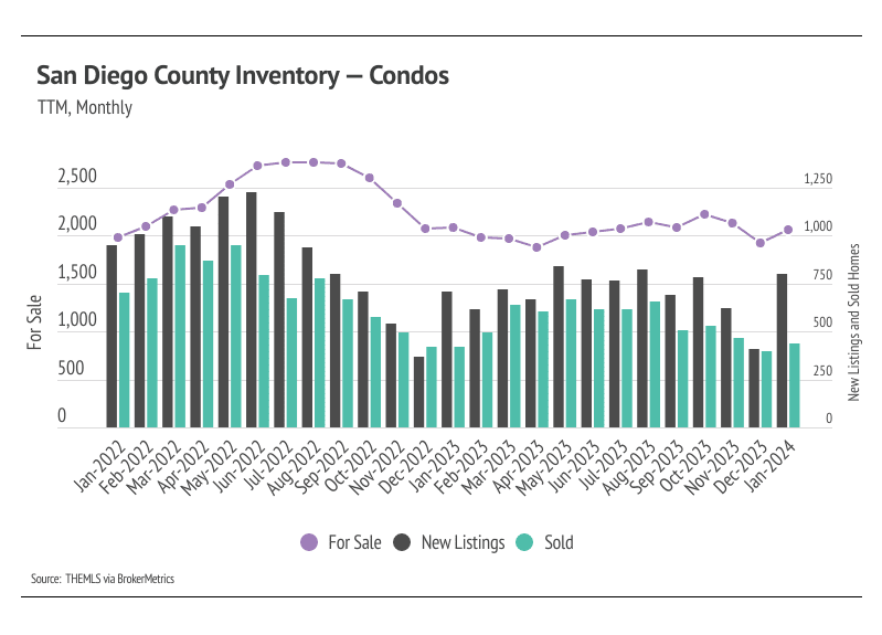 After hitting all-time lows in December 2023, single-family home and condo inventory, sales, and new listings have shown an increase from December to January 2024. The low inventory and new listings, coupled with high mortgage rates, contributed to a slower housing market. However, 2024 is already demonstrating signs of a more normal year, with a nearly 100% month-over-month increase in new listings and a 52% increase in homes coming under contract. While inventory and sales are down year over year, new listings have seen a 7% increase.